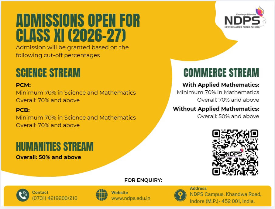 Latest News NEW SCHOOL FRONT OFFICE OPENED FOR PARENTS AND VISITORS ON DECEMBER 7,2021 NEW INDOOR SPORTS BUILDING OPENED FOR STUDENTS IN NDPS ON DECEMBER 7, 2021 NDPS ranked 6th in India and 1st in MP and Indore NDPS At a Glance Admissions Academic Life School Life Co-curriculars Achievements Campus